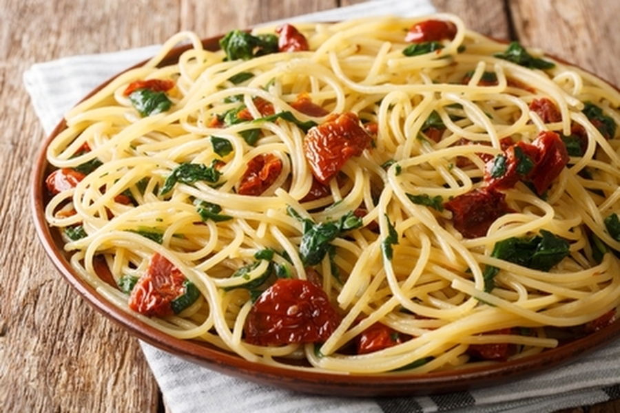 • Spaghetti ze szpinakiem i suszonymi pomidorami.